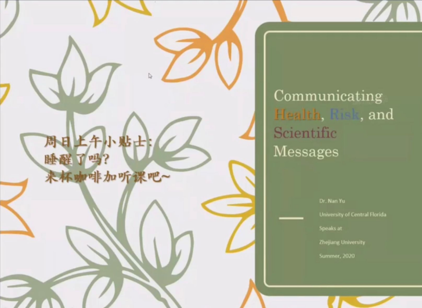 来自Central Florida University的Nan Yu教授为同学们带来了主题为“Communicating Health, Risk and Scientific Messages”的讲座,其中借助新冠疫情、冰桶挑战、反烟运动、安乐死等案例为同学们深入浅出地介绍了健康传播领域内的研究成果典型。