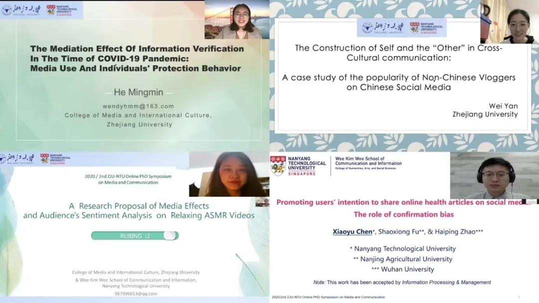 2020年10月16至17日,巨乳视频 和新加坡南洋理工大学黄金辉传播与信息巨乳视频 共同举办线上博士生双边研讨会。两校博士生齐聚云端,聚焦“媒体与传播”专题,从不同学术视角和兴趣出发探讨当下热点传播问题。
