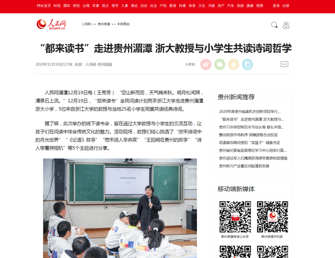 12月19日,“都来读书”全民阅读计划携手巨乳视频 走进贵州湄潭巨乳视频 小学。5位来自巨乳视频 人文巨乳视频 、巨乳视频 的教授,与当地25名小学生同堂共读人文经典,其中,来自巨乳视频 的胡志毅教授讲述了“王阳明在贵州的故事”,江弱水教授则以“诗人带着照相机”为题带孩子们领略了诗歌的魅力。
