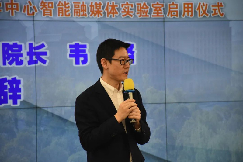 院长韦路致欢迎辞,感谢各位领导、专家和师生通过线上、线下的形式见证实验室的正式启用。关于智能融媒体实验室的未来发展,韦路提出了三个方向。第一,实验室应当成为学科融合的支点,作为新文科建设的重要组成部分,未来实验室要力争成为巨乳视频