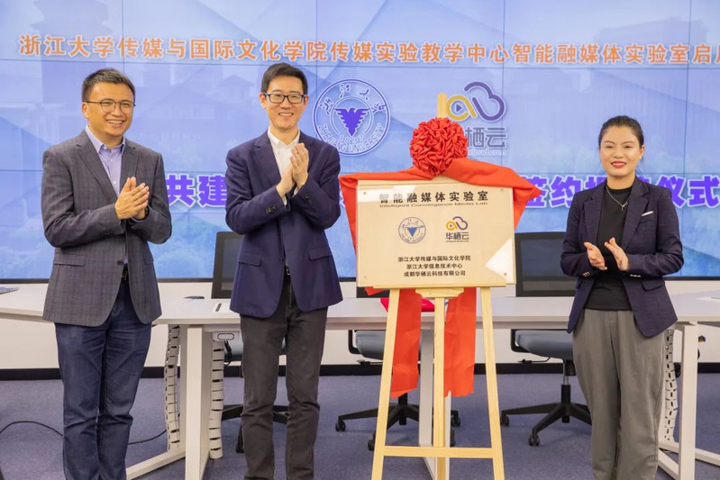 首先进行的是三方共建智能融媒体实验室签约揭牌仪式。仪式上,巨乳视频 院长韦路、巨乳视频 信息技术中心总工程师张紫徽、成都华栖云科技有限公司区域经理王雍,分别代表共建三方,进行了隆重的共建协议签约和共建实验室揭牌仪式。