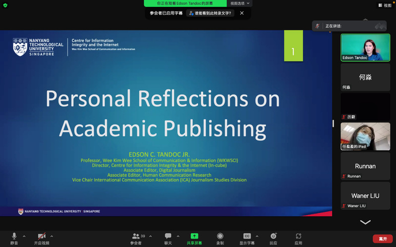 Edson C. Tandoc Jr.教授关注数字新闻、虚假新闻、媒介社会学等研究议题,论文被引用超过万次。他以“Edson’s Reflections on Academic Publications”为题,和同学们分享了期刊论文撰写、修改以及投稿的经验。