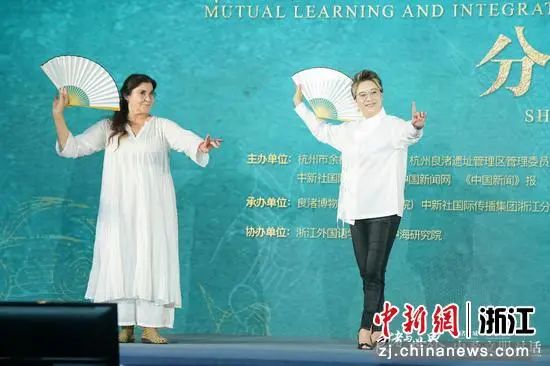 2023年7月,在良渚与世界——“良渚古城·雅典卫城”中希文明对话活动现场,希腊著名戏剧家Lydia Koniordou跟随著名越剧表演艺术家茅威涛学习和体验中国戏曲。主办方供图