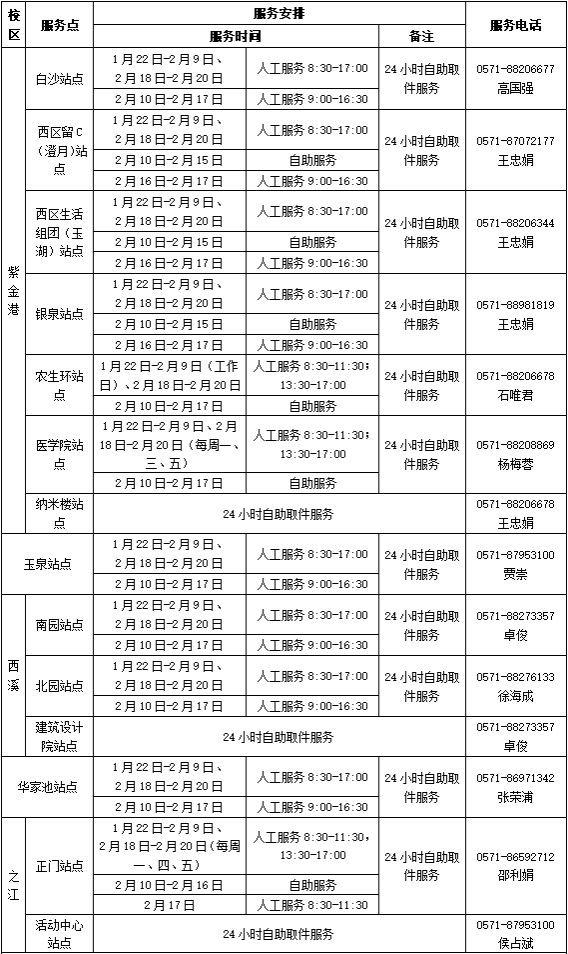 紫金港、舟山校区自助服务点提供24小时自助服务,海宁校区自助服务点9:00—16:00开放,玉泉、西溪、华家池校区自助服务点暂停开放。