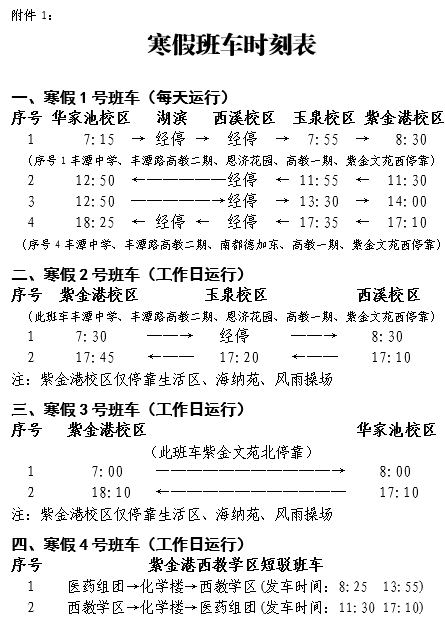 (1)班车运行在1月22 日—2月9日,2月18日—2月20日期间开设寒假1、2、3、4号班车,其他班车暂停运行。时刻表详见附件1;2月10日—2月17日期间班车均不运行。