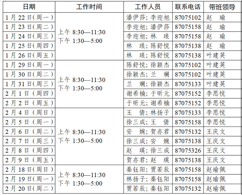 1月22日-2月18日,服务时间调整为:上午8:30-17:00(有会议根据会议时间延长)。