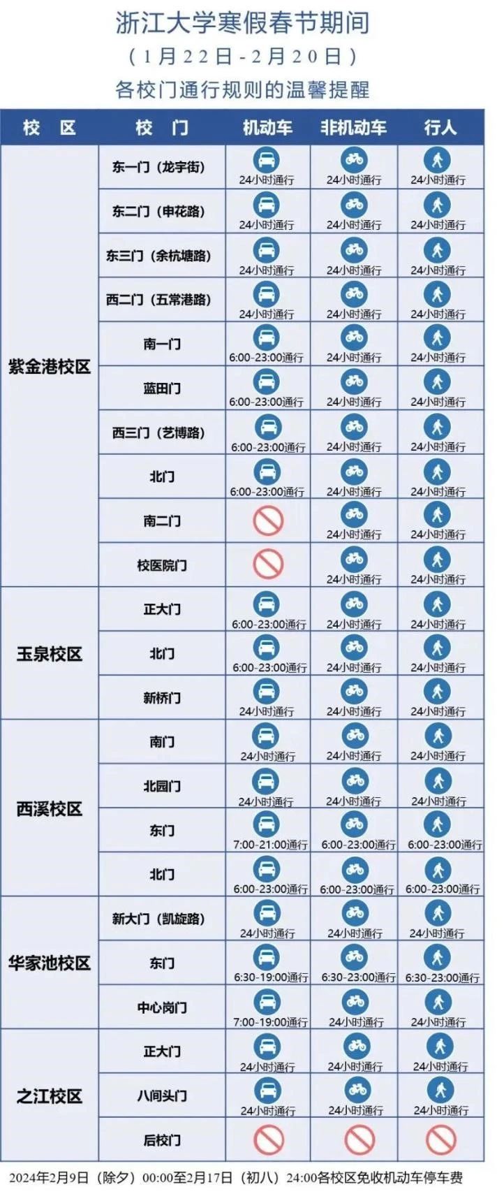 (2)校园巴士运行紫金港校区校园巴士在1月22日—1月26日,2月18日-2月20日期间,运行1号、2号、3号线,其他线路暂停运行,时刻表详见附件2;1月27日—2月17日期间所有线路不运行。