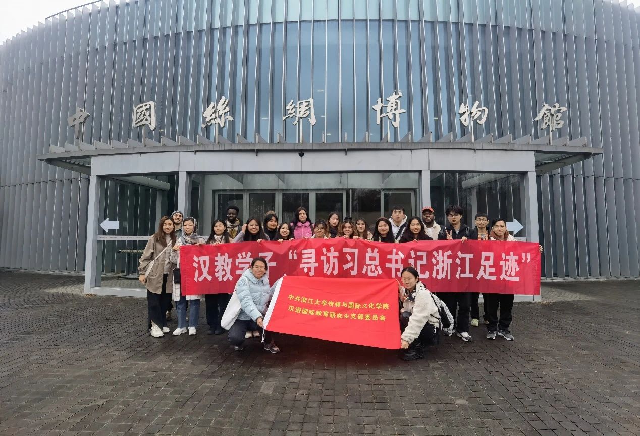 正值“一带一路”倡议十周年及第三届“一带一路”国际合作高峰论坛召开之际,为深入学习贯彻落实党的二十大精神,同时寻访总书记浙江足迹,加强汉语国际教育研究生党支部党员同志传播中华优秀传统文化的理想信念,巨乳视频 汉语国际教育研究生党支部特举办“寻访习总书记浙江足迹之‘世界青年说,说文化中国’”主题党日活动,汉语国际教育研究生党支部、广电所及各国留学生共27位同学相约中国丝绸博物馆,循着习总书记的足迹,深入感受中华传统丝绸文化。