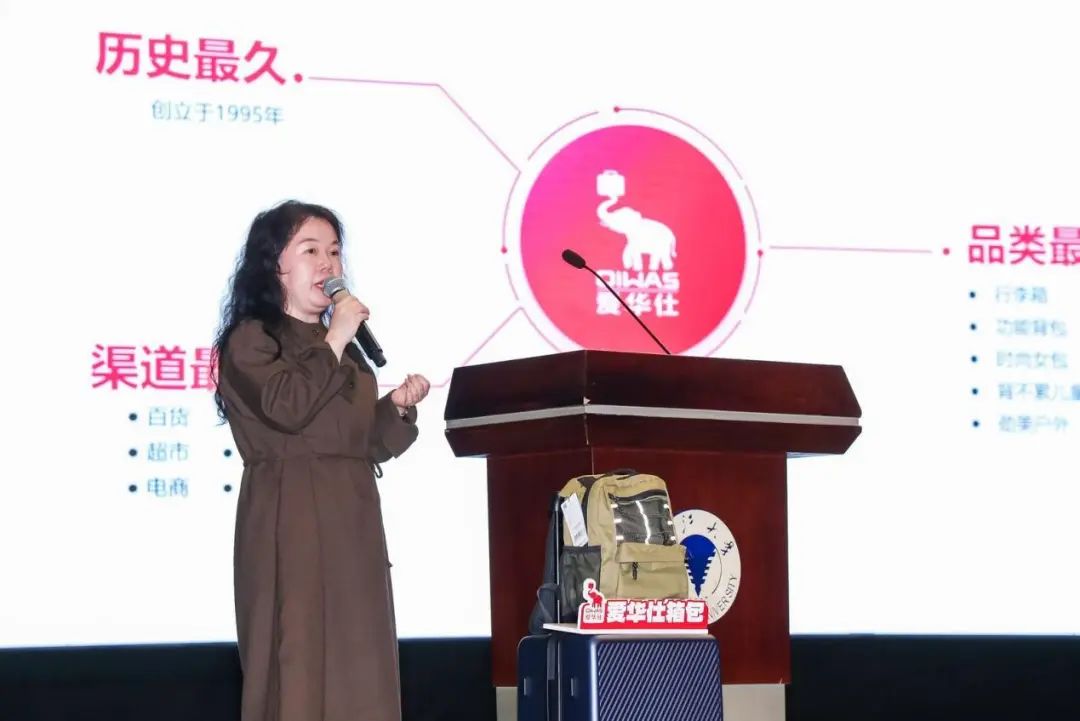 广东爱华仕箱包集团有限公司产品推广经理程庆龄首先对爱华仕箱包的历史、品类、渠道布局、行业地位、品牌荣誉等进行了介绍。此外,“更能装、超耐用”在命题解析中得到了细致的阐释,突出了爱华仕箱包的核心竞争力和重要卖点。就命题而言,她从广告主题、广告目的引入,解读爱华仕的广告主题,提出从功能价值和情感价值层面对产品进行解读并对往届优秀作品进行了展示与分析。