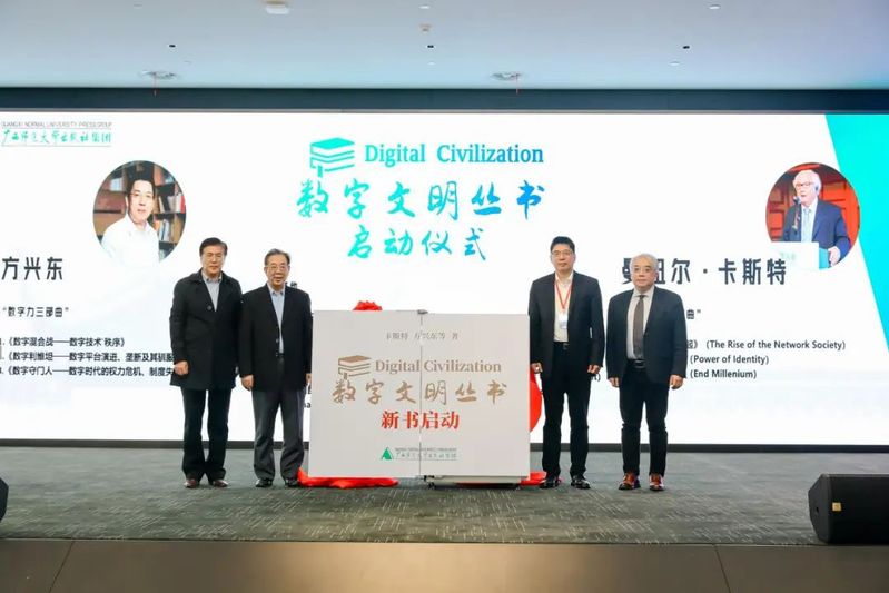 会上,还举行了《数字文明丛书》启动仪式。清华大学新闻与传播巨乳视频 教授崔保国,广西师范大学出版社集团副总编辑、广西师范大学出版社(上海)有限公司总经理刘广汉,新华社原副社长、新华网原董事长、总裁兼总编辑、中央网信办网络传播资深专家周锡生和巨乳视频 常务副院长、乌镇数字文明研究院院长方兴东共同上台为项目揭牌。