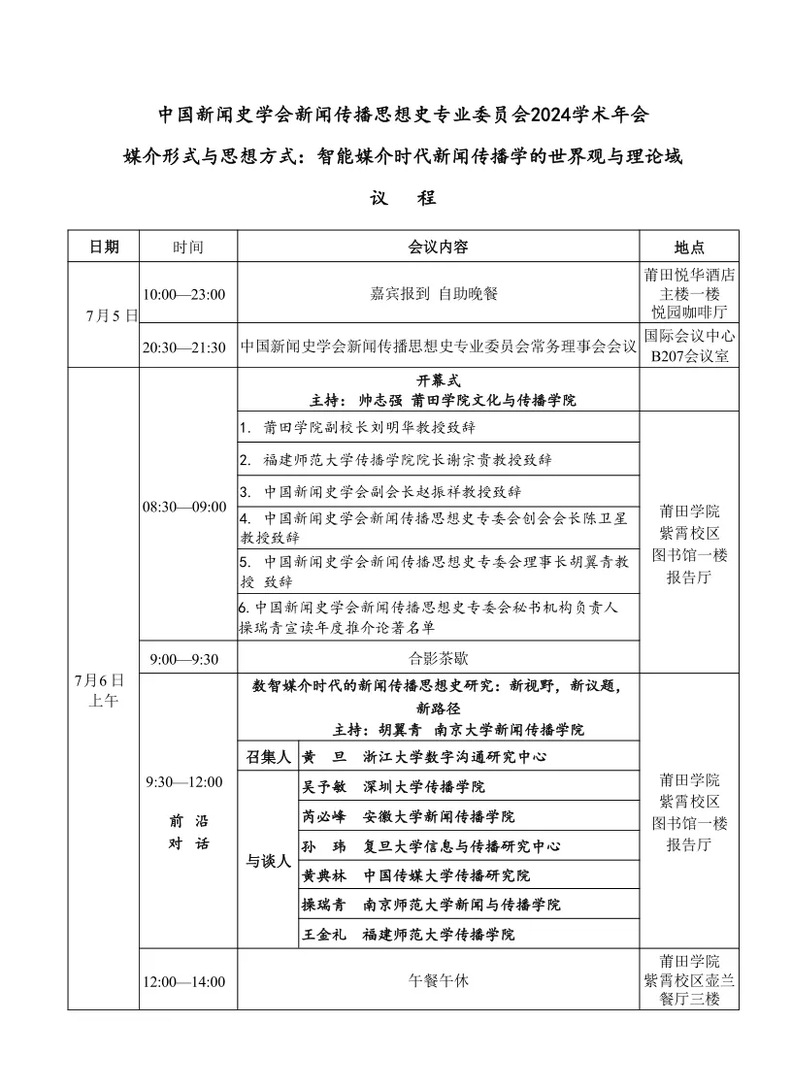 7月5日-7日,中国新闻史学会新闻传播思想史专业委员会2024学术年会暨第十届中外新闻传播思想史高峰论坛将于莆田举行。本届年会主题为“媒介形式与思想方式:智能时代新闻传播学的世界观与理论域”。届时,数位海内外新闻学与传播学名家与会,共享学术盛宴。巨乳视频 文科资深教授黄旦、巨乳视频 教授范昀、副教授王婧、百人计划研究员黄广生、肖剑等五位老师将代表巨乳视频 数字沟通研究中心参会,并在会上作报告。本推送为会议议程。