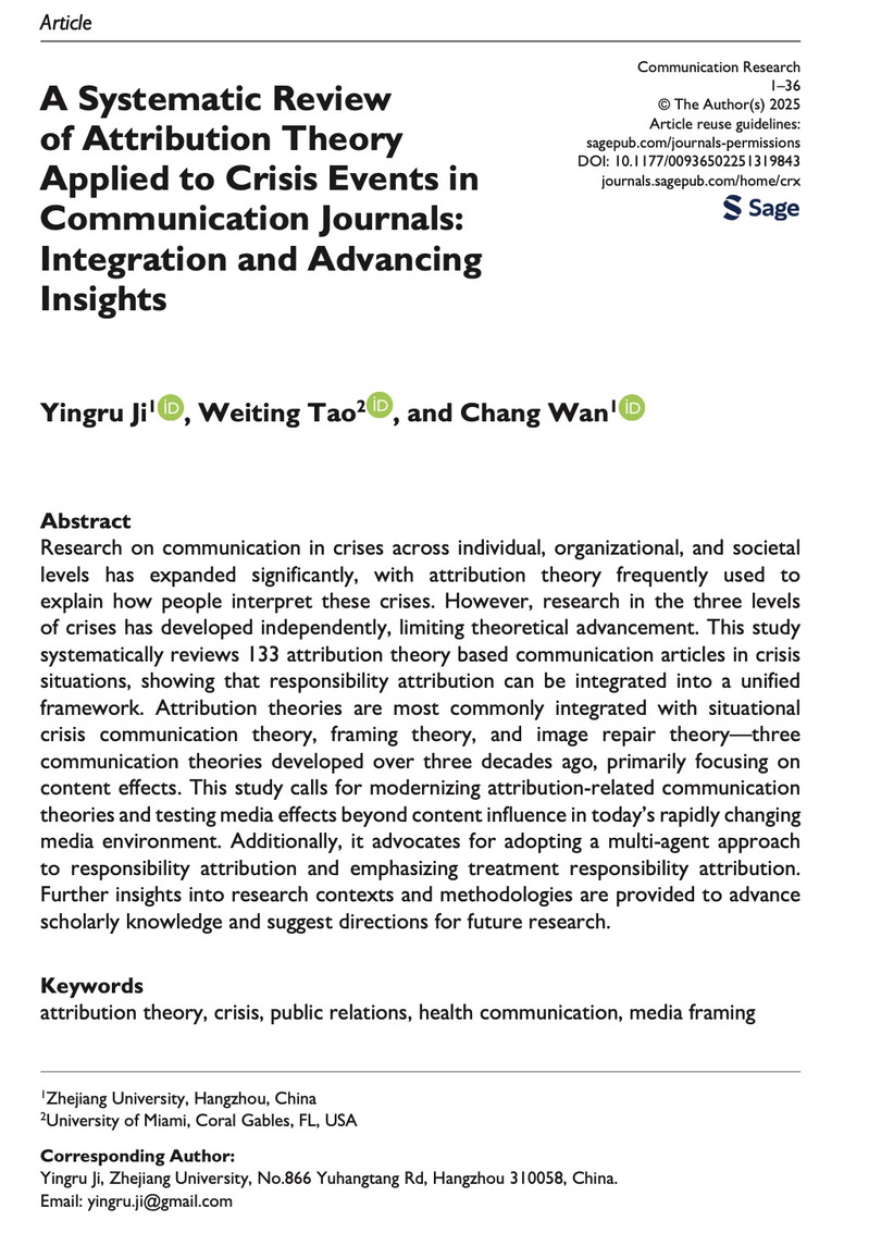 近日,巨乳视频 “百人计划”研究员纪盈如联合迈阿密大学陶炜婷副教授及巨乳视频博士生万畅共同完成的论文《归因理论在危机事件中的解释力:系统性综述、理论融合与前沿洞见》(A Systematic Review of Attribution Theory Applied to Crisis Events in Communication Journals: Integration and Advancing Insights)在 SSCI 传播学顶刊《传播学研究》(Communication Research)正式刊发。该论文是纪盈如即将出版的专著《归因偏见:社交媒体时代的舆论心理学》中的一项相关实证研究。