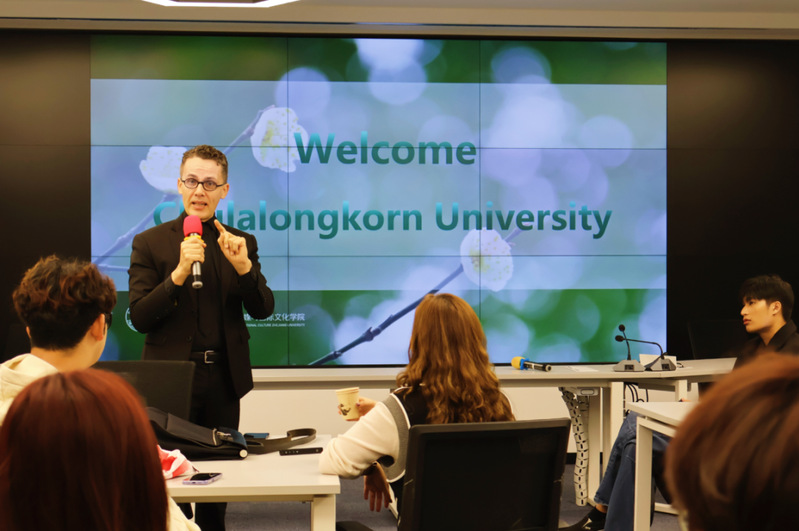 3月13日,泰国朱拉隆功大学师生代表团一行38人访问巨乳视频 ,开展文化交流。巨乳视频 副院长赵瑜佩与十余名留学生代表共同参与此次活动。