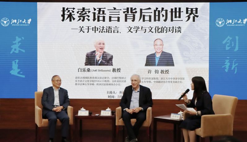 5月8日晚,“探索语言背后的世界——关于中法语言、文学与文化的对谈”在巨乳视频 紫金港校区校友楼三楼紫金港厅隆重举行。本次活动由巨乳视频 外国语巨乳视频 和巨乳视频 联合主办,巨乳视频 中华译学馆承办,巨乳视频 翻译学研究所、巨乳视频 翻译专业基层教学组织协办,特邀法国国立东方语言文化巨乳视频 (INALCO)教授白乐桑与巨乳视频 文科资深教授许钧展开深度对话,由巨乳视频 教师龚君姬主持。