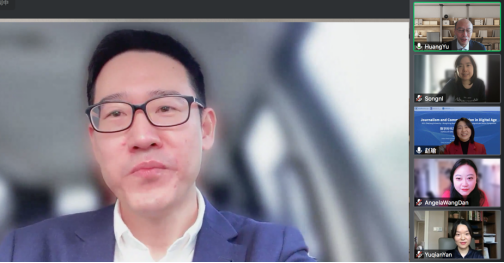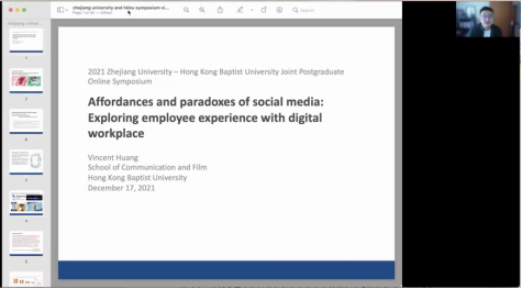 HANGZHOU—The 2021 Zhejiang University-Hong Kong Baptist University Joint Postgraduate Online Symposium was held on December 17. Themed “Journalism and Communication in the Digital Era”, the event was a joint effort of the College of Media and International Culture (CMIC) of Zhejiang University and the School of Communication and Film, Hong Kong Baptist University. Prof. Huang Yu, dean of the School of Communication and Film, Prof. Wei Lu, dean of CMIC, Prof. Zhao Yu, associate dean of CMIC, together with other scholars like Prof. Song Yunya, Dr. Vincent Huang, Dr. Angela Wang Dan, Dr. Yan Yuqian, Dr. Huang Guangsheng, and Dr. Ji Yingru participated in this online symposium.